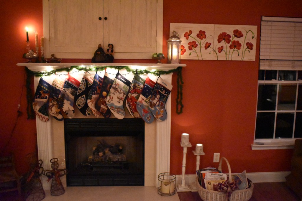 Mamaw’s straw angels sit beside the fireplace on one side, along with the little wooden chair and broom from our childhoods. On the other side of the fireplace are white candle holder stands and holders and a big wicker basket with a big Christmas bow. The basket is filled with all the Christmas books I brought back from France, the ones we read to our boys in Christmases gone by and that we now read with the grandkids, and they read to us. The blessedness of time passing and coming back around to make new memories of the old.