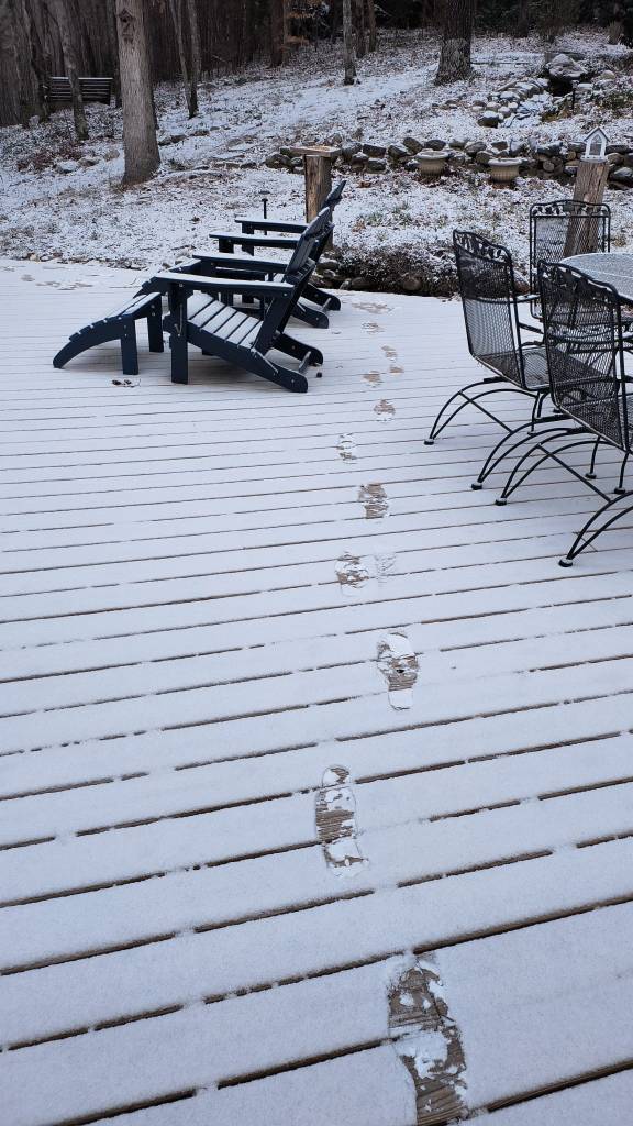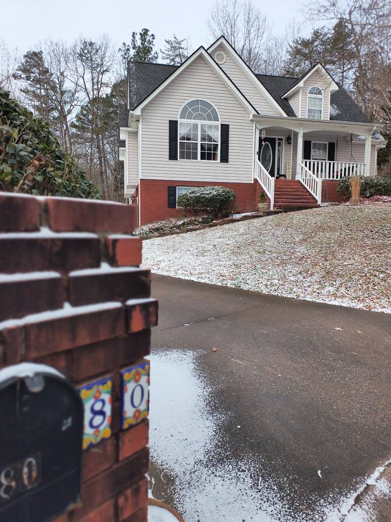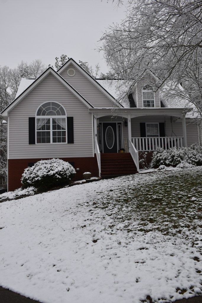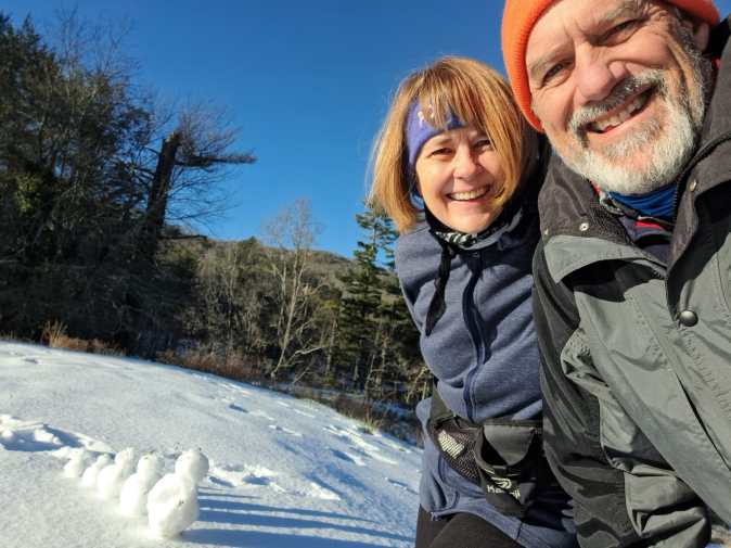 Snow in the North Carolina mountains where we made 5 mini snowmen in honor of our grandkids./Neige dans les montagnes de Caroline du Nord, où nous avons fait 5 mini bonhommes de neige en l’honneur de nos petits-enfants.