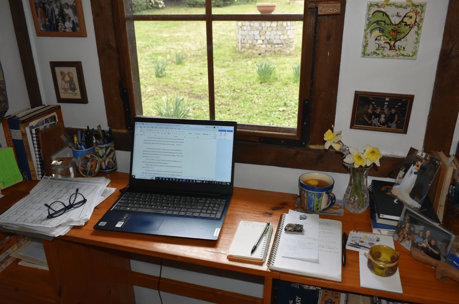 I’m in my happy place at my desk in the Chalet with a cup of tea in a favorite mug, a large piece of dark chocolate with almonds, the daffodils and hyacinths bringing sweet fragrance, and surrounded by photos of people I love as well as my laptop and other tools of the writing trade.