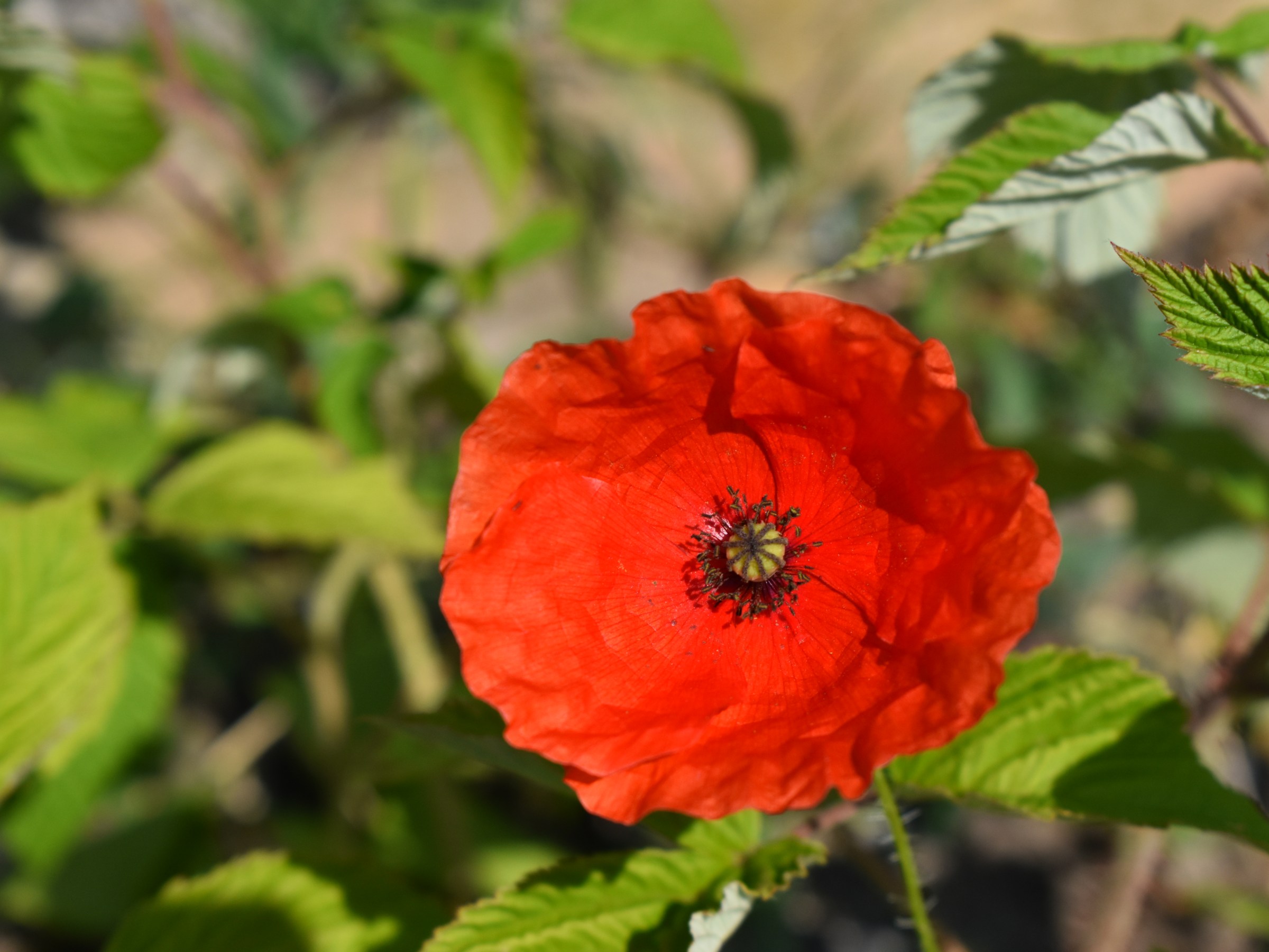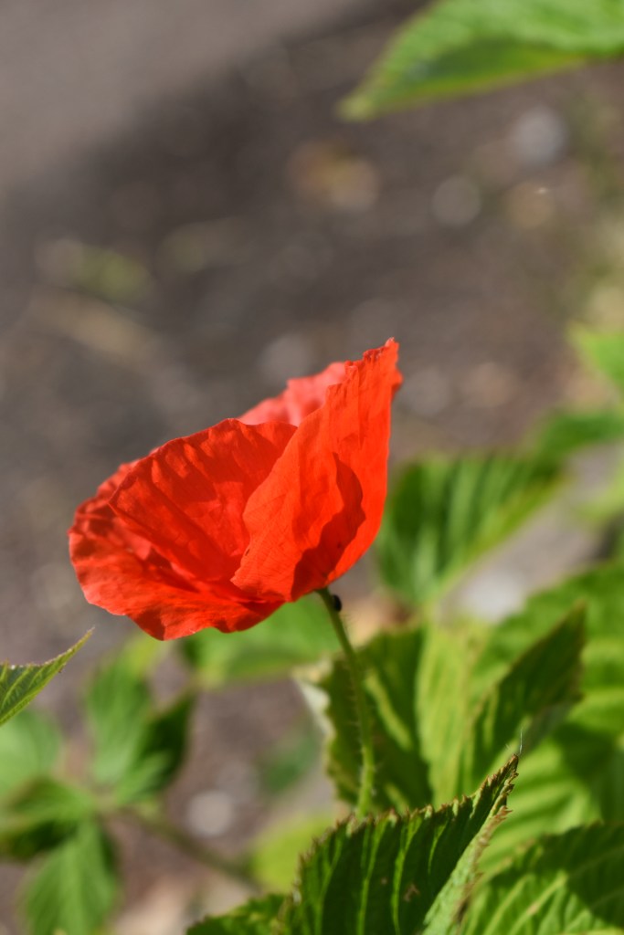As we headed out to the driveway, I spotted something red in the flower bed near the pool, the one with raspberries and rosemary. Intrigued, I walked over to it, and to my great surprise, found a red poppy. A lone red poppy peeking out from between the raspberry leaves.